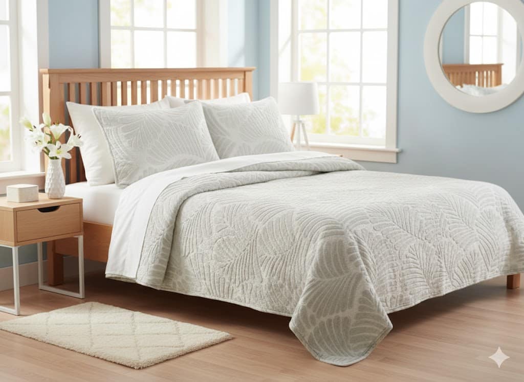 يتميز هذا الطقم بتصميم أنيق بنمط أوراق الشجر المحفورة، ولون فاتح يضفي إشراقًا وهدوءًا على ديكور غرفتك.