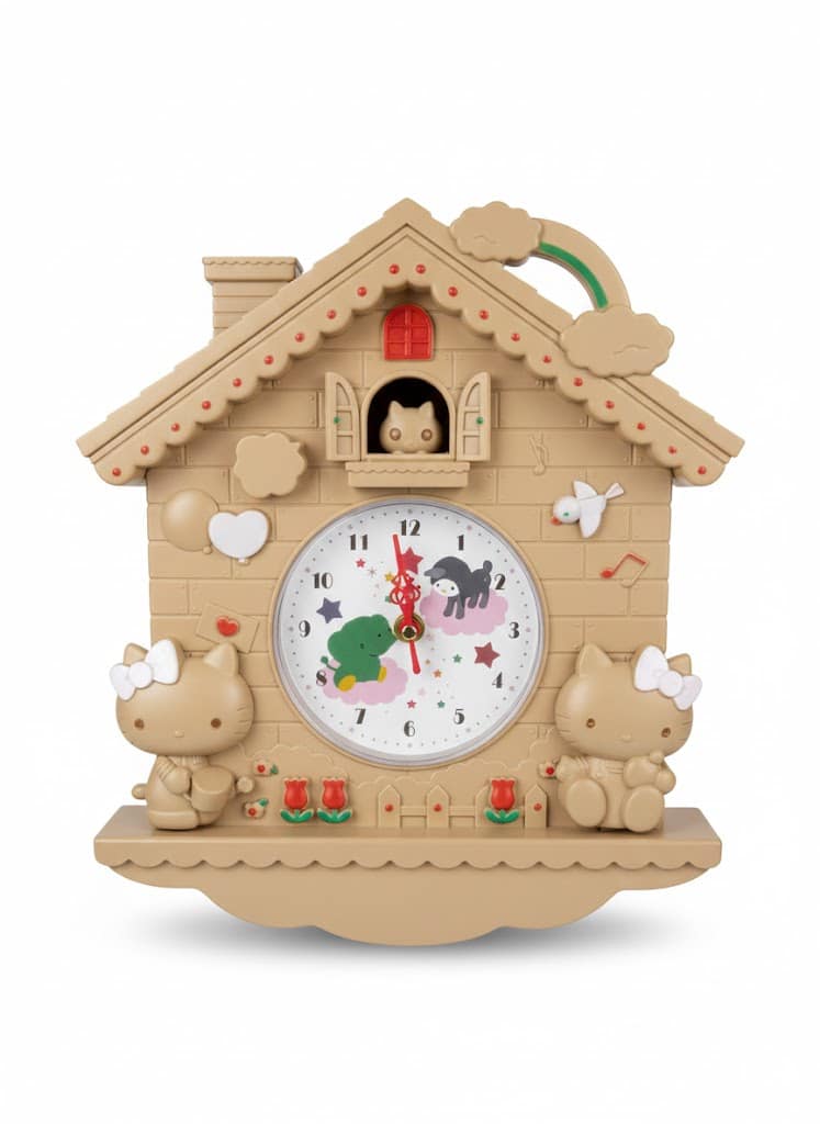 التصميم: تصميم مرح مستوحى من بيوت الوقواق التقليدية، على شكل منزل بلون بيج فاتح، مزين بتفاصيل جذابة مثل الغيوم وقوس قزح وطيور وورود