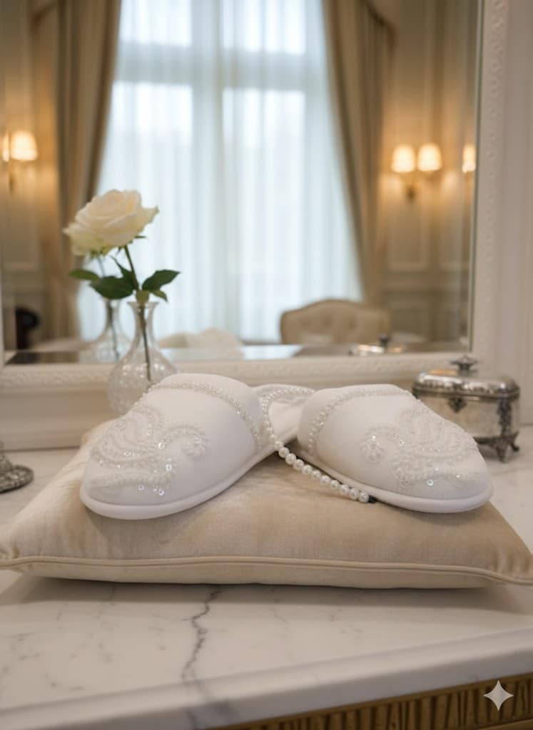 تصميم فاخر: يتميز بتصميم أنيق باللون الأبيض، مزين بتطريزات دقيقة من الخرز واللؤلؤ على مقدمة الحذاء وحوافه