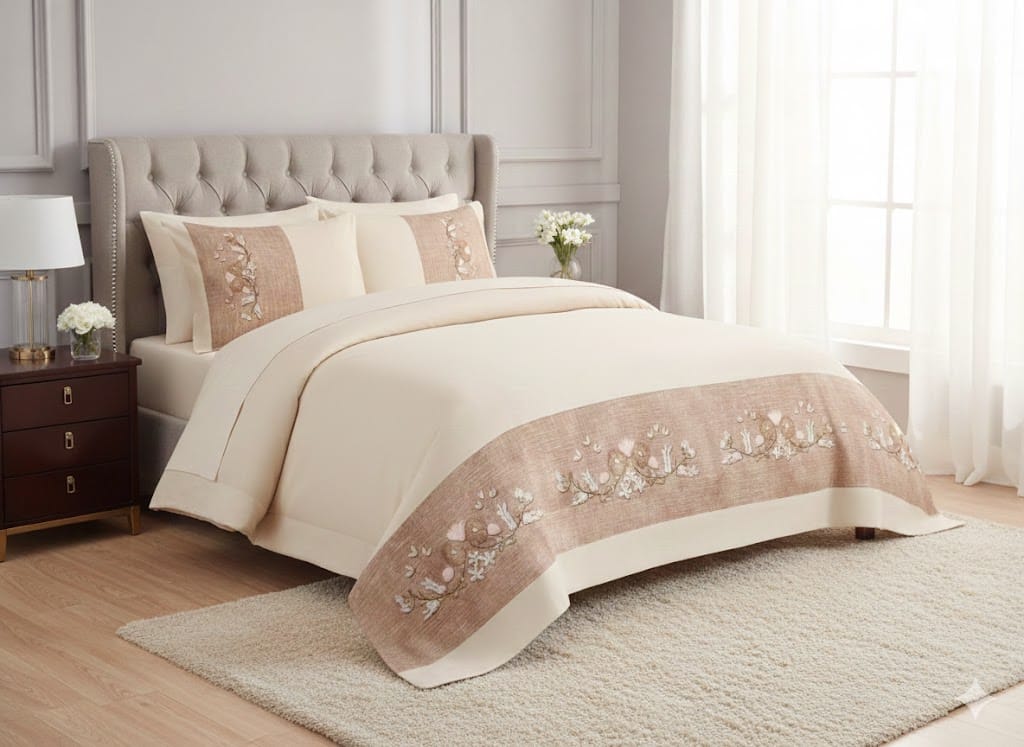 يتميز هذا الطقم بتصميمه الكلاسيكي العصري، حيث يجمع اللون البيج الفاتح الهادئ مع تطريز دقيق وجذاب على حواف الملاية والخداديات. الموديل مصنوع من أجود خامات القطن التركي، المعروفة بمتانتها الفائقة ونعومتها التي تدوم طويلاً، مما يضمن لكِ الراحة المثلى في كل الفصول.