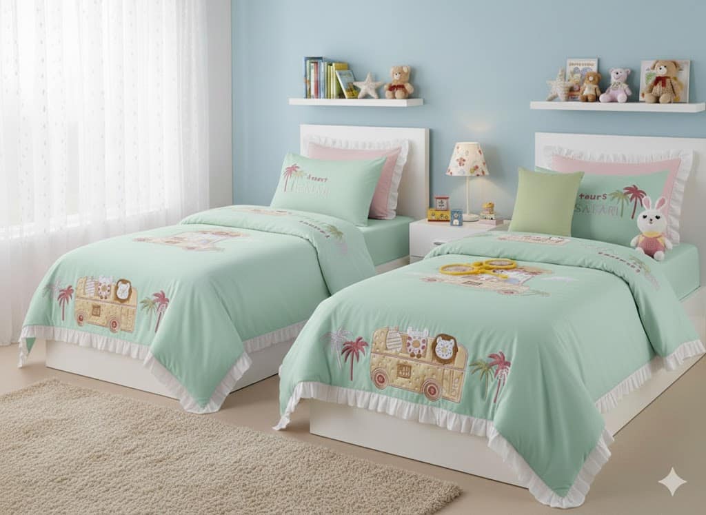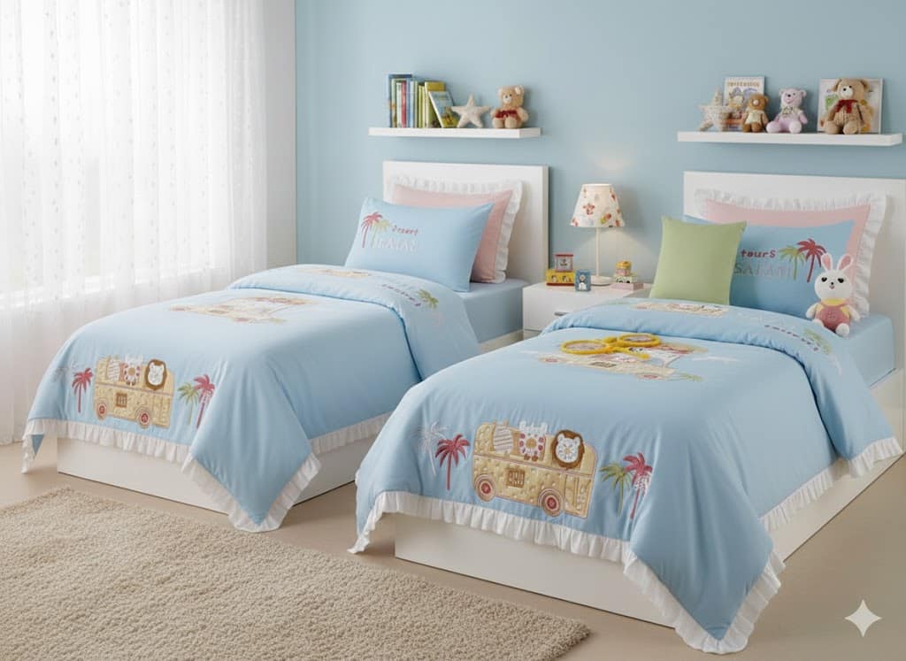 التصميم: يتميز برسومات شاحنات سفاري ونخيل وأسود لطيفة وألوان زاهية تضيف حيوية وسعادة لغرفة الأطفال