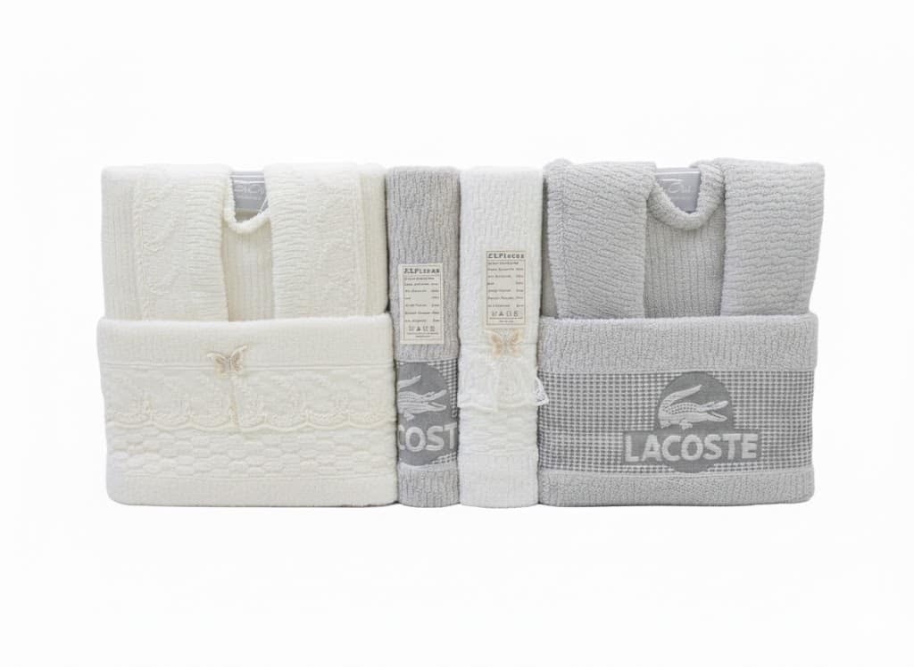 (Lacoste) يأتي بتصميم زوجي أنيق وفاخر، يجمع بين البساطة والرقي. يتميز أحد البرنسين أو الفوط بنقشة الجاكار التي تحمل شعار لاكوست