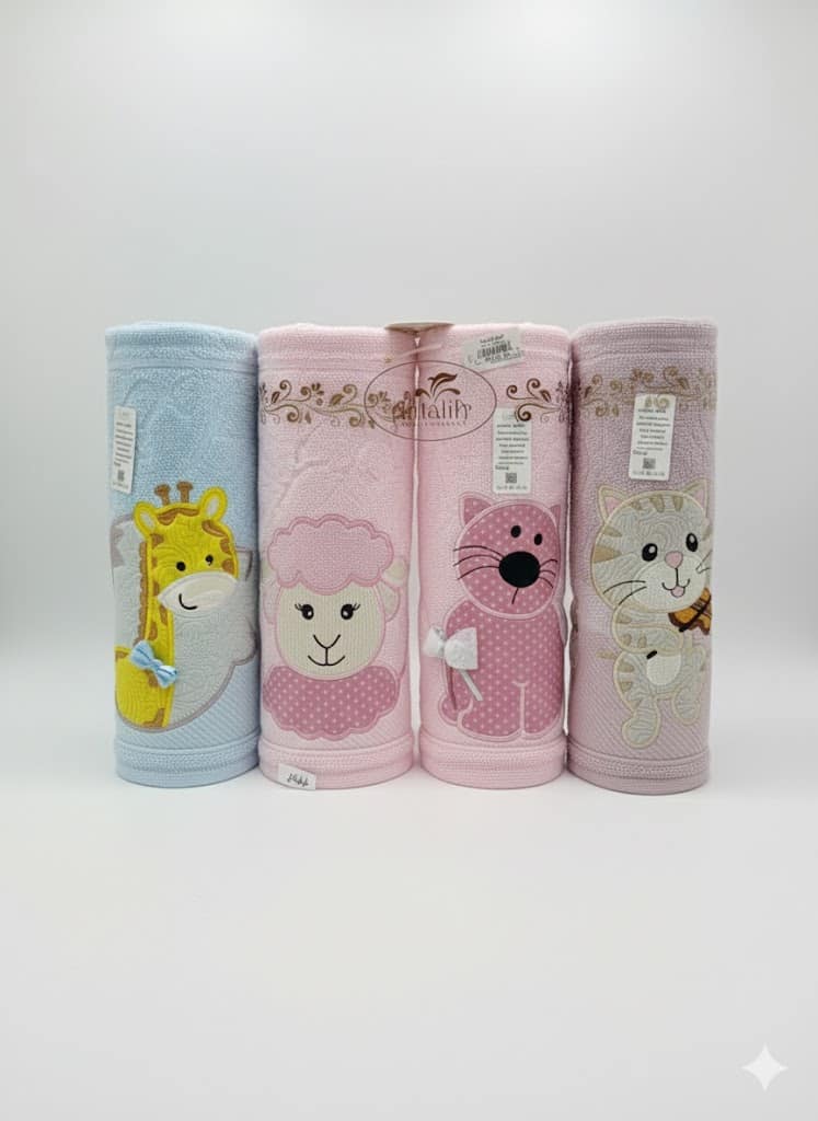 التصميم: يتميز برسومات كرتونية مطرزة وجذابة (مثل الزرافة والدب والقطط) بألوان الباستيل المبهجة، مما يضيف لمسة من البهجة لوقت استحمام طفلكِ