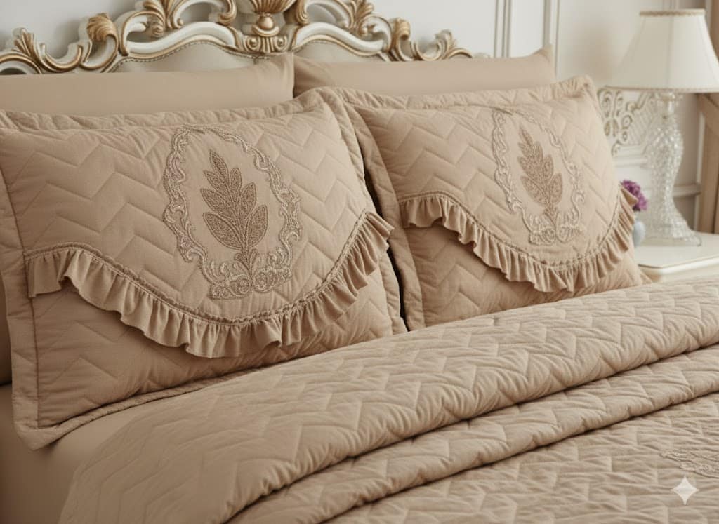 التصميم: كابتونيه ومطرز بالدانتيل والكرانيش الأنيقة على الحواف وأكياس المخدات
