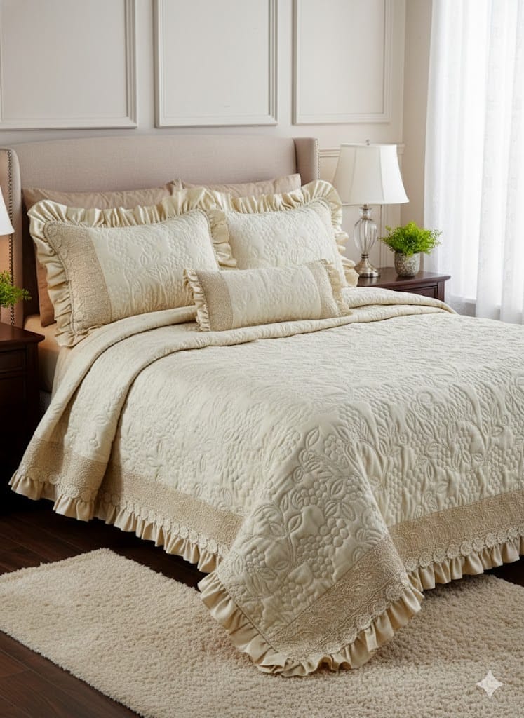 بلونه البيج/الأوف وايت الأنيق، وتصميمه الكابتونيه المزخرف، وحواف الكرانيش الجذابة، يضيف هذا الطقم لمسة كلاسيكية عصرية إلى أي غرفة نوم. استمتعي بنعومة القطن وجودة التصنيع العالية التي تضمن لكِ المتانة والاستخدام الطويل الأمد