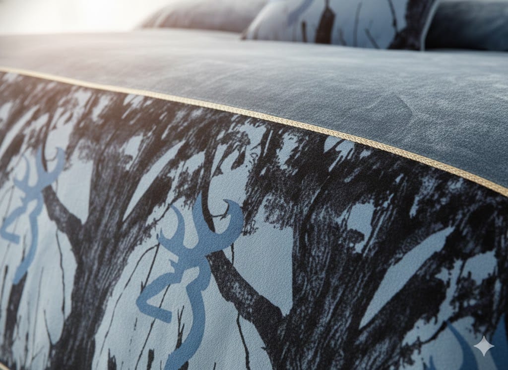 التصميم: يتميز بطبعة فنية وجذابة لأغصان وأشجار باللون الأزرق ودرجات الرمادي/الأسود على خلفية فاتحة، مما يضيف لمسة من الأناقة والهدوء لديكور غرفتك