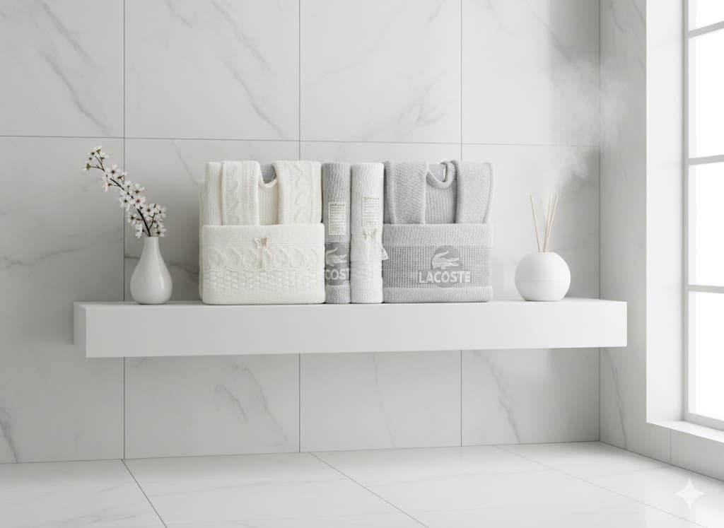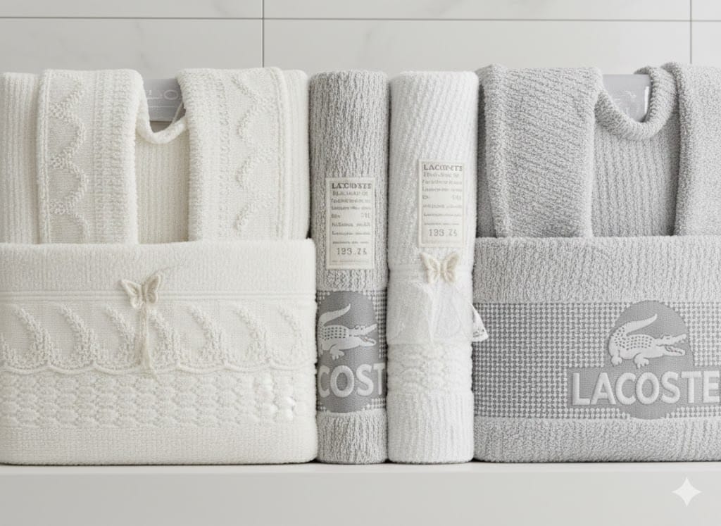 (Lacoste) يأتي بتصميم زوجي أنيق وفاخر، يجمع بين البساطة والرقي. يتميز أحد البرنسين أو الفوط بنقشة الجاكار التي تحمل شعار لاكوست