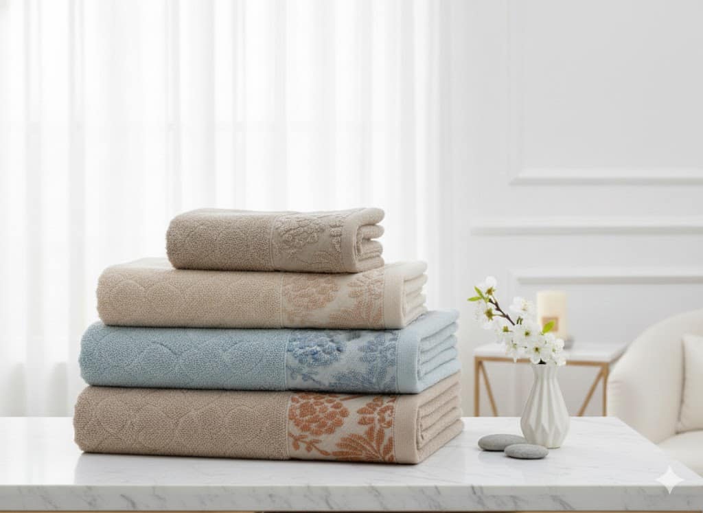 : تتميز الفوط بنقوش جاكار كلاسيكية وراقية بألوان ترابية هادئة (تشمل البيج، الكريمي، والبني الفاتح) لتضيف لمسة فنية جذابة لديكور منزلك