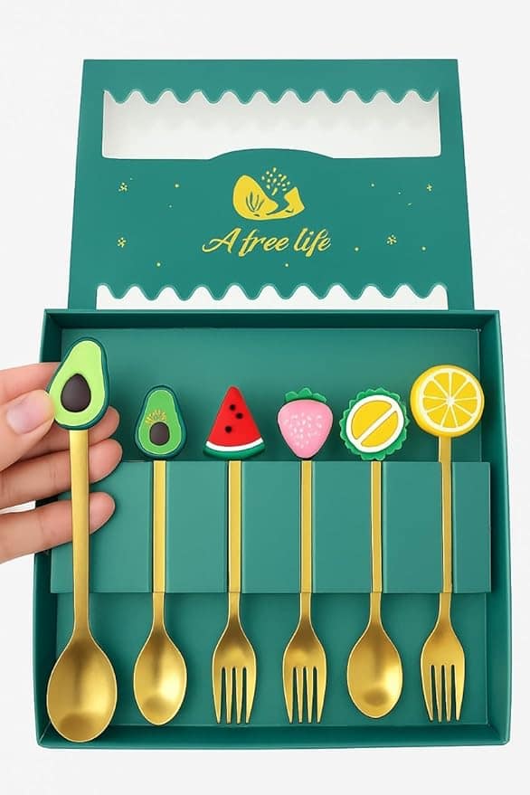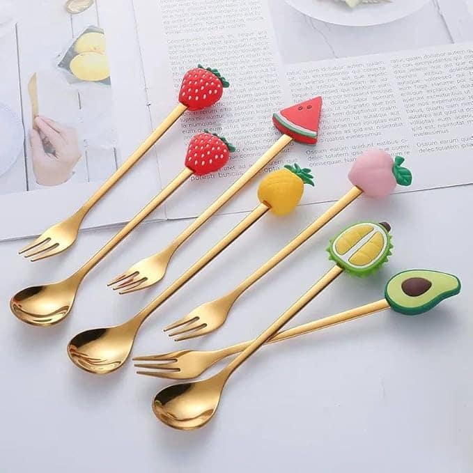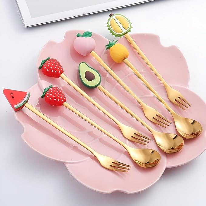 تصميم يفتح الشهية: رؤوس الملاعق والشوك مزينة بأشكال فواكه ثلاثية الأبعاد (فراولة، بطيخ، أفوكادو، أناناس..) بألوان زاهية تجذب الكبار والأطفال على حد سواء