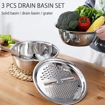 طقم من 3 قطع مكون من مصفاة ومبشرة ووعاء لغسل الخضراوات وأداة مطبخ من الستانلس ستيل