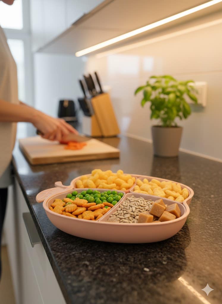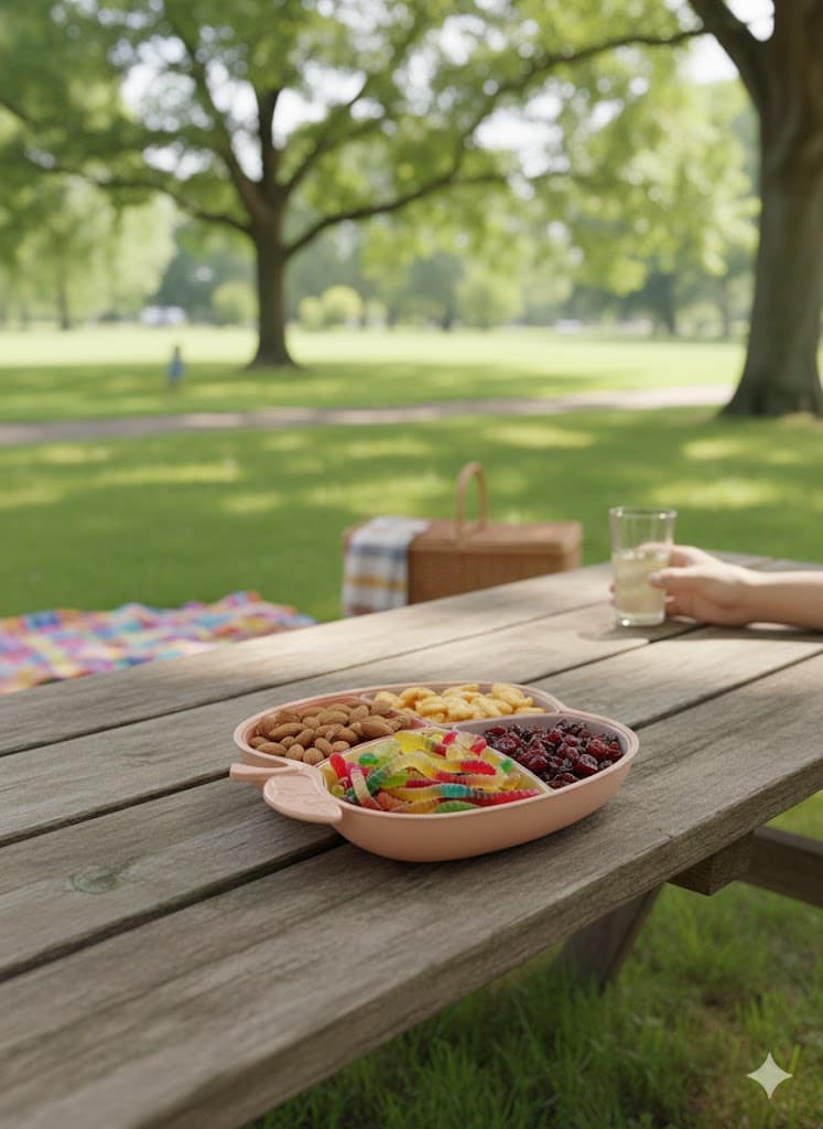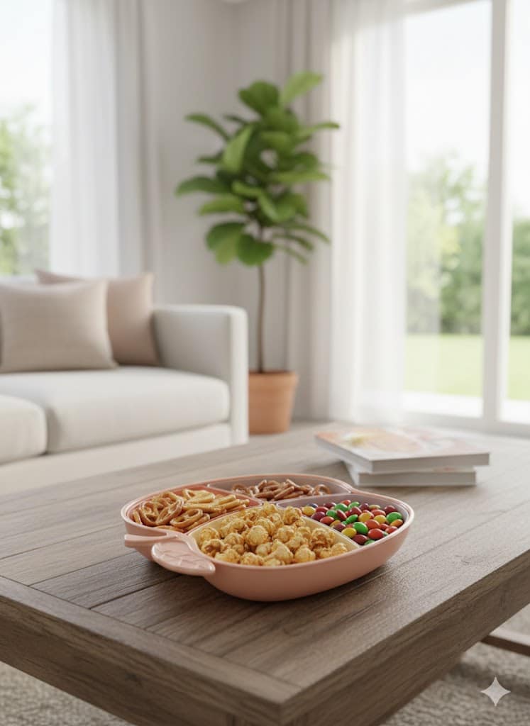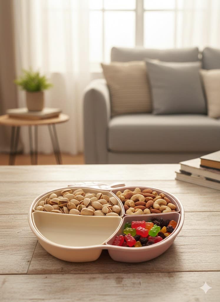 تصميم ذكي ومقسم: الطبق مقسم لـ 4 خانات داخلية واسعة، تقدري تقدمي فيها أنواع مختلفة من (المكسرات، الكاندي، الفواكه المجففة، أو حتى المقبلات) من غير ما يختلطوا ببعض