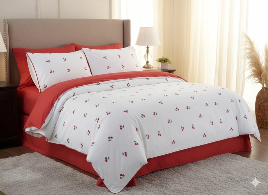 الجذاب نقوش الكرز الصغيرة و الموزعة بعناية تضفي لمسة من المرح والرومانسية لديكور غرفتك مع حواف انيقة بلون احمر غني يحدد جمال التصميم : “Pink Cherry” تصميم