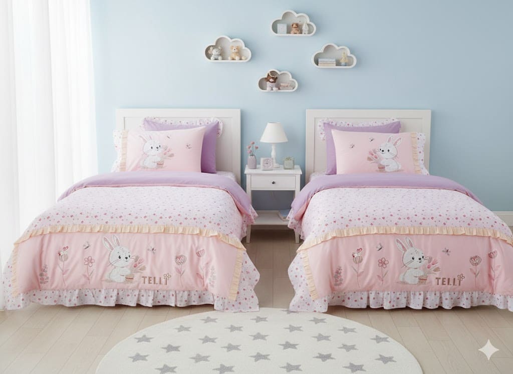 تصميم “الأرنب” الجذاب: يتميز برسومات أرنب كرتوني محبوبة وزهور رقيقة على خلفية وردية هادئة، مما يضيف لمسة من البهجة والمرح لغرفة النوم