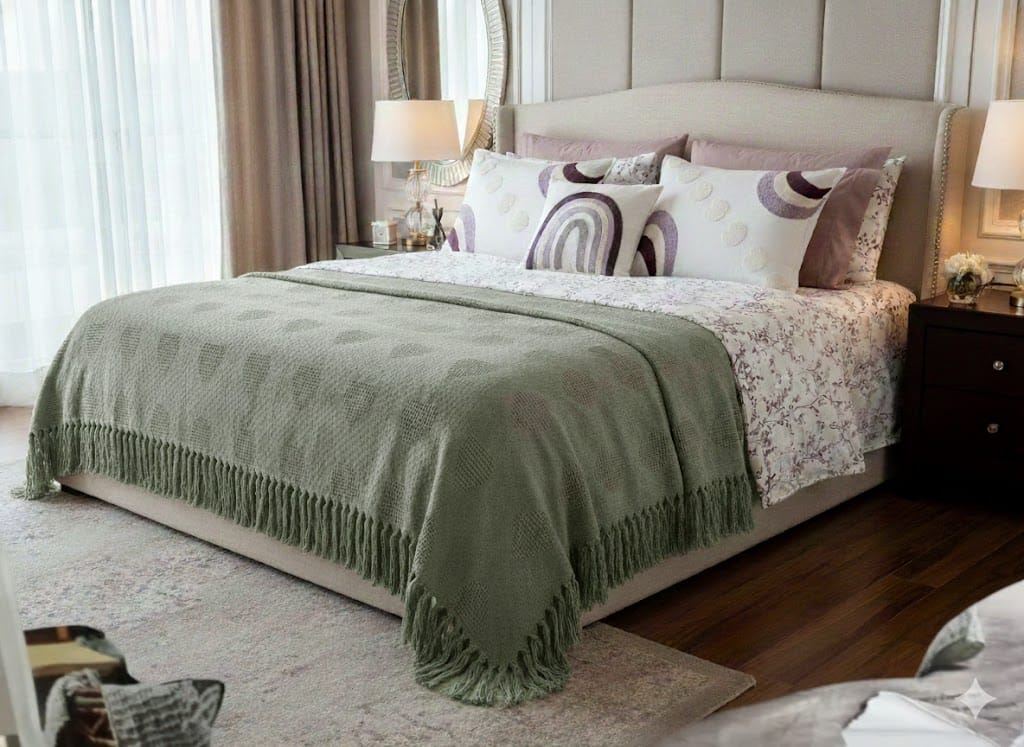 التصميم: يتميز بنقوشات هادئة على شكل أقواس قزح (أو هلال) على أكياس الوسائد، وحواف بشراشيب على الكوفرتة لمظهر عصري ومميز