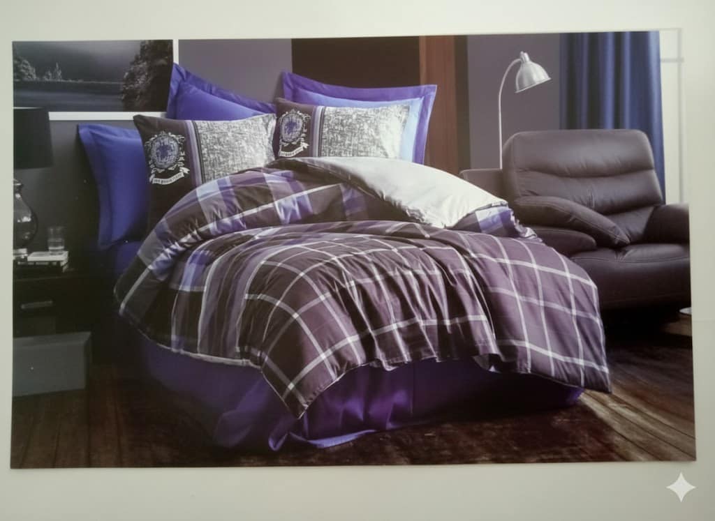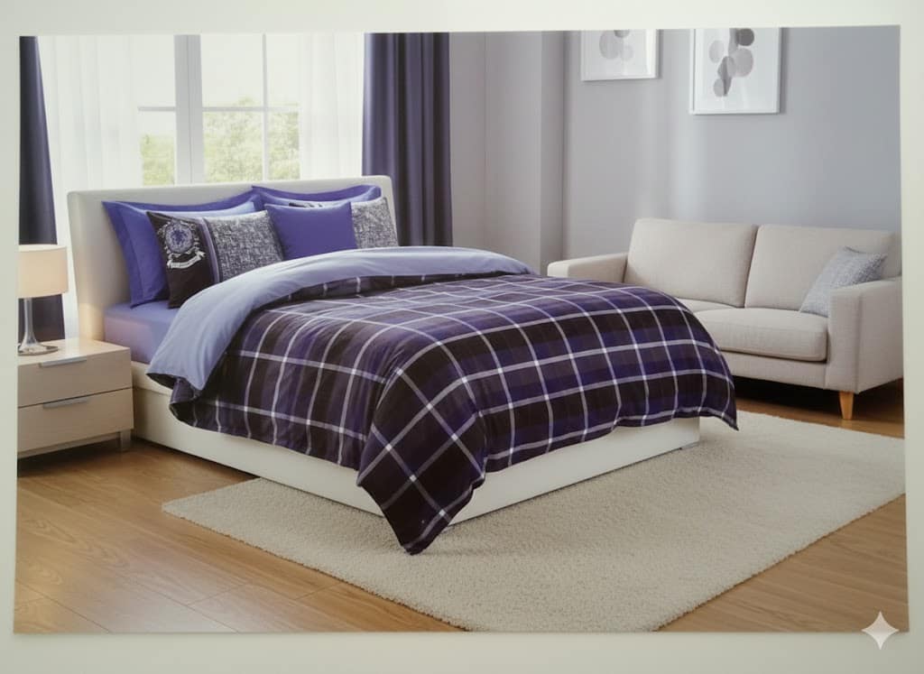 التصميم: يتميز بنقشات مربعات كلاسيكية بألوان جذابة، مع وسائد سادة وأخرى مطرزة بشعار أنيق