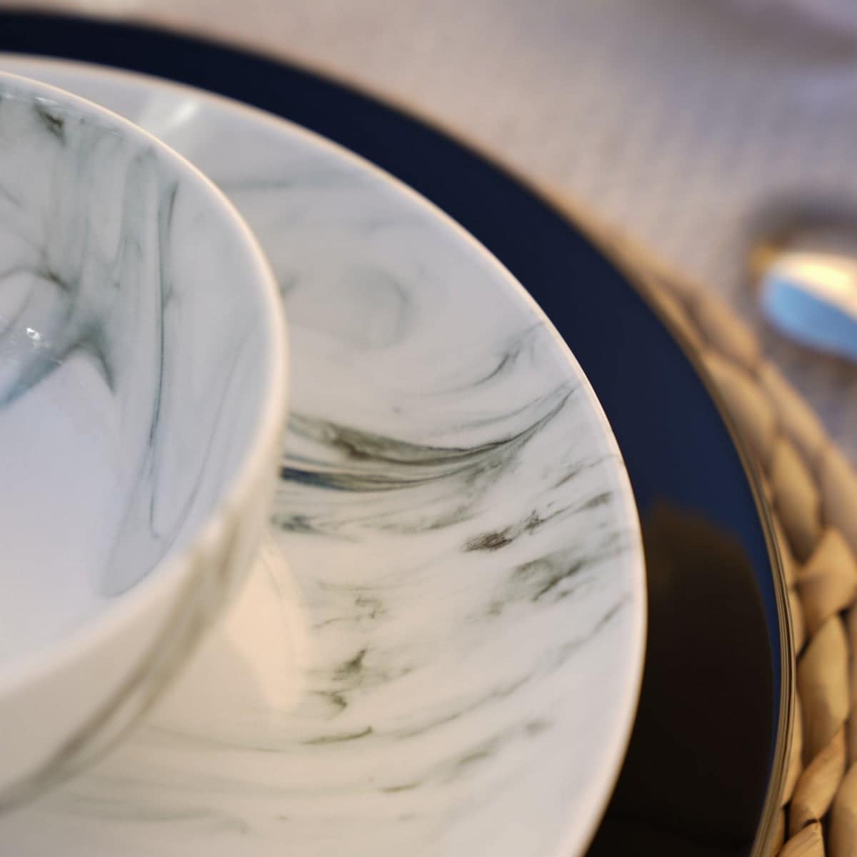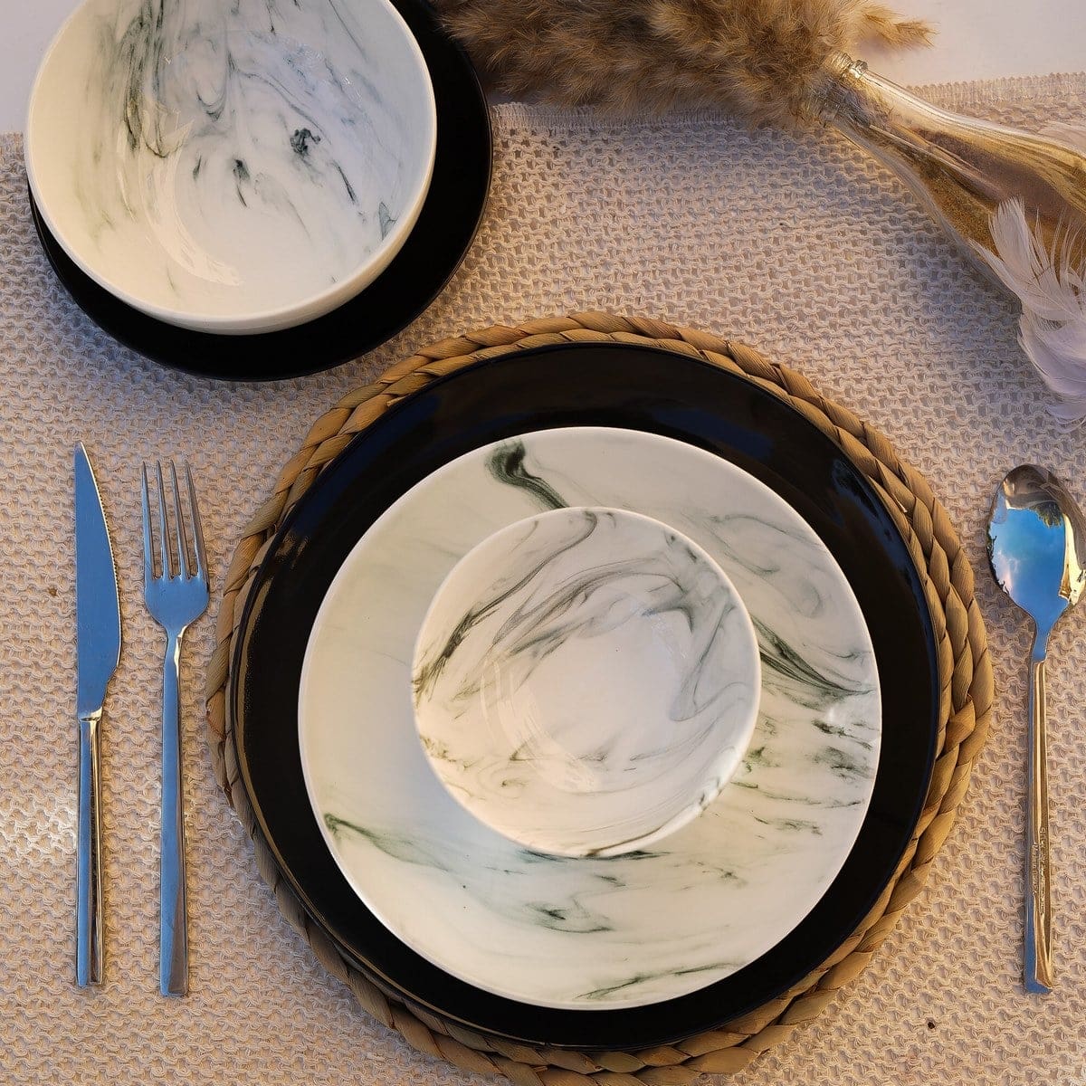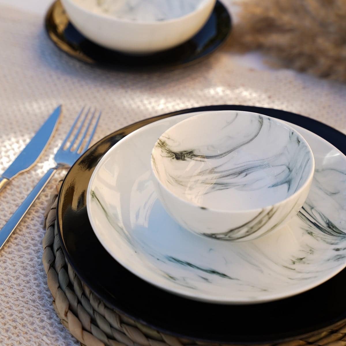اجعل كل وجبة تحفة فنية مع طقم العشاء هذا، حيث يلتقي الأسود الفاخر بـالرخام الأبيض الأنيق لتقديم تجربة طعام لا تُنسى