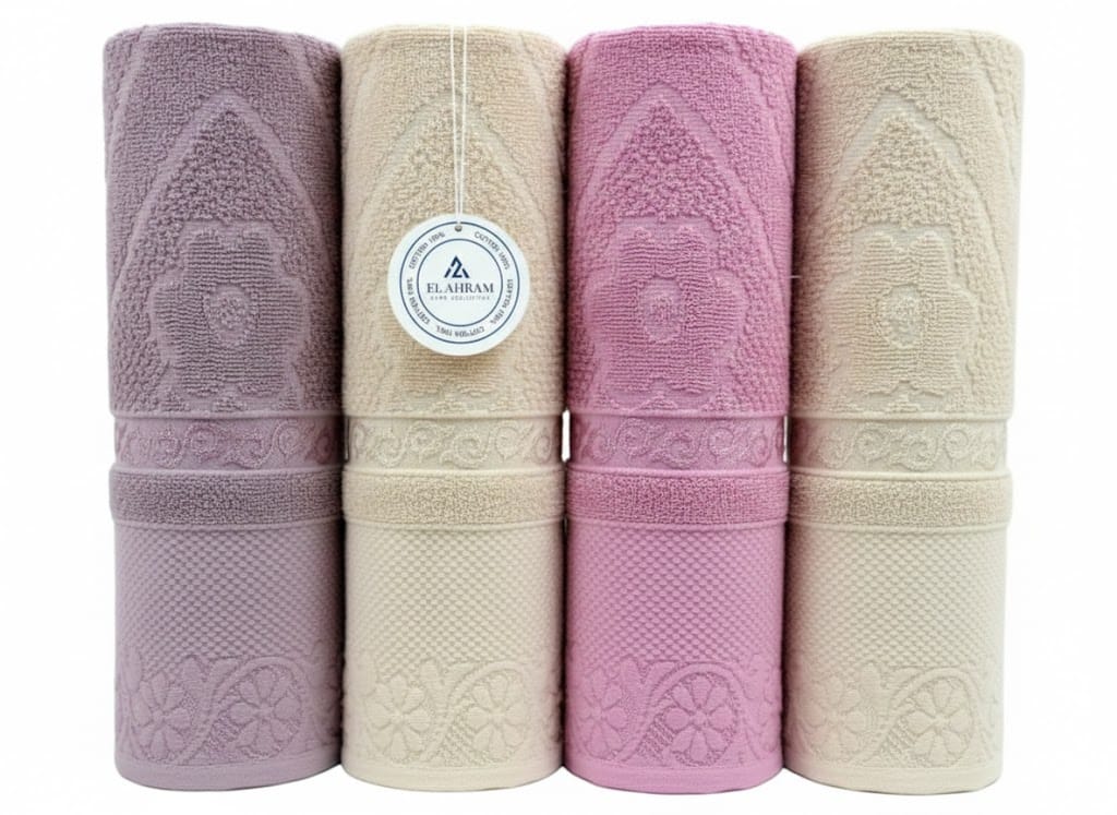 تصميم جاكار كلاسيك: تتميز الفوط بنقوش جاكار مطرزة وأنيقة تضيف لمسة جمالية راقية لديكور منزلك، بألوان جذابة تشمل البينك، البيج، الخوخي، والأخضر الفاتح