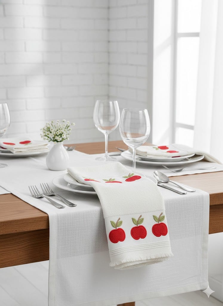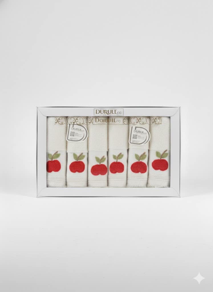 التصميم: تتميز الفوط بتطريزات فواكه جذابة (مثل التفاح الأحمر في الصورة) وكنار شراشيب أنيق، مما يضيف لمسة جمالية ومبهجة