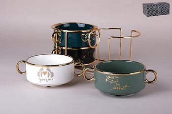 التصميم: يتميز بتصميم عصري وجذاب، حيث يغطي اللون الأبيض جسم الفنجان والصحن مع وجود رسمة ظلية سوداء أنيقة لغزال أو أيائل، بالإضافة إلى حافة ذهبية رفيعة تضفي لمسة من الرقي